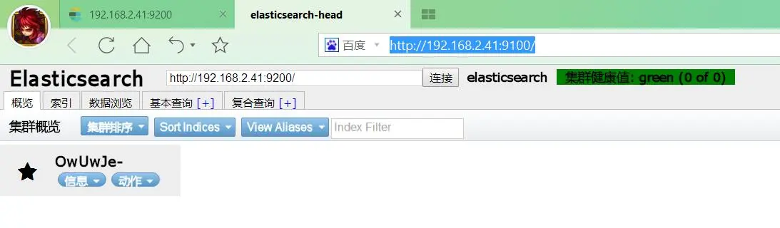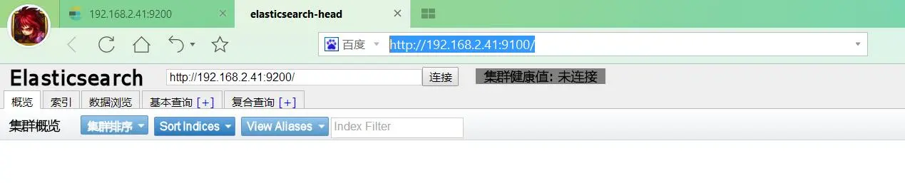 npm run start通过上述命令的操作,我们已经安装好 elasticsearch-head 插件。通过浏览器访问 http://192.168.2.41:9100,如下图: