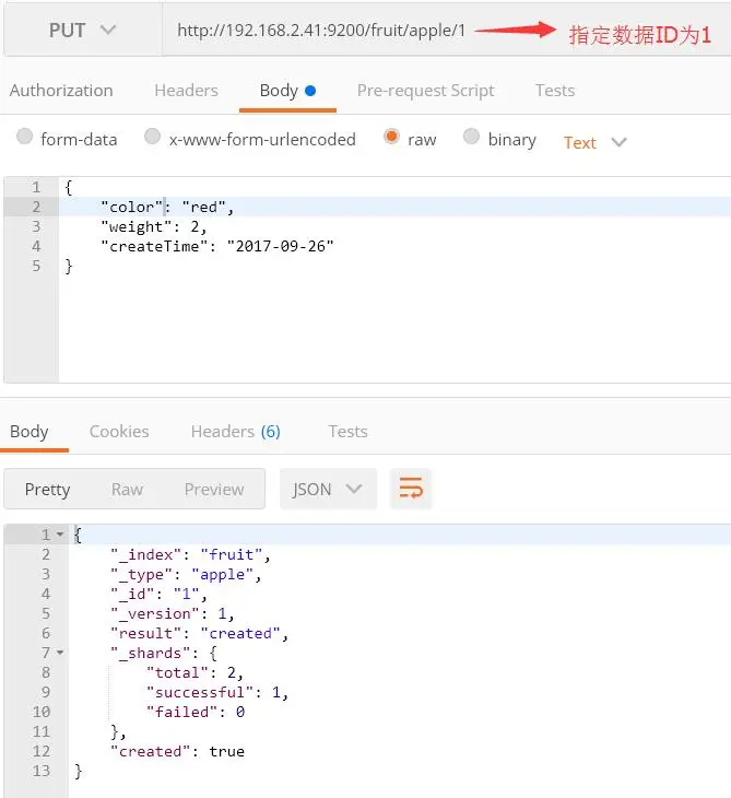 插入指定 ID 的数据,需要使用 PUT 请求。如下图: