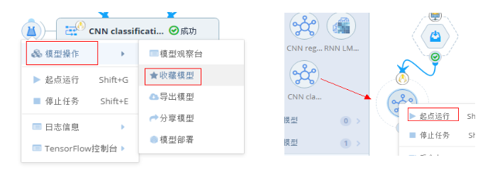 模型收藏:在模型操作下选择收藏模型可以将模型收藏到tesla界面左边的个人模型目录下,下一次需要使用的时候可以直接拖出模型节点,填写相应的配置参数,右键选择起点运行即可。