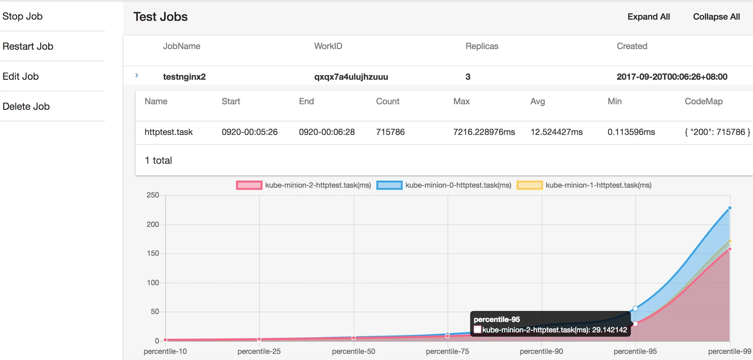 运行完测试的效果,目前还没有加入测试中的client,server资源监控,但是简单的测试统计已经有了。如图是测试的一个运行在1G虚拟机的nginx容器的测试结果。测试结果同时有各个节点的运行结果和汇总结果,同时绘制latency的百分位图。