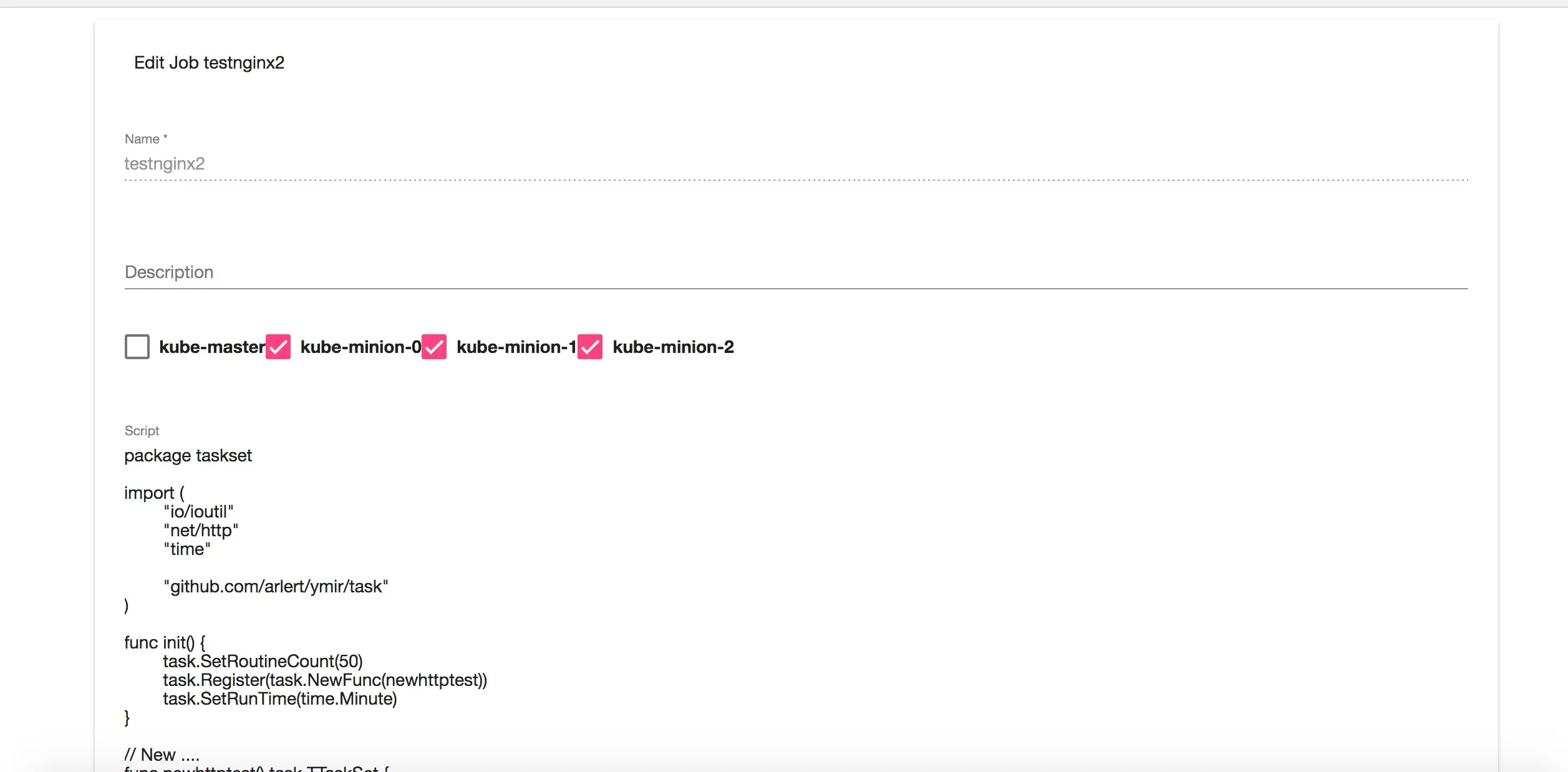 golang本身是编译型语言,不是脚本语言,运行要先编译,但是因为编译很快,实际上很容易当成一个脚本来执行,比如这个例子。或者显式的运行go build,go run,像docker/distribution项目的dockerfile这样。那么要实现一个"动态"运行golang的工具要做的就是:定义一种类型的任务,用户的测试脚本只要实现这种任务的interface,客户端就可以装载这种脚本编译运行。具体举例如下。
