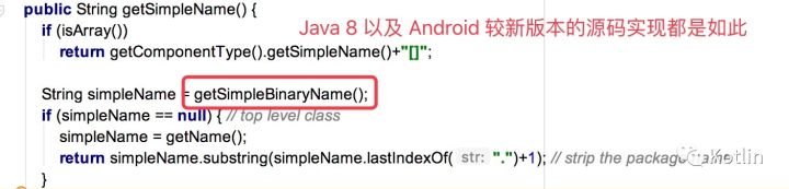 为什么 Api 19 获取 simpleName 不会报错,而等到后面那句才会报错呢?因为它的 simpleName 的实现与后面新版本不太一样: