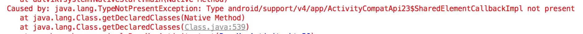我们看到前面截图中,错误显示是在某一处的代码通过反射去获取 ActivityCompatApi23 的内部类的时候,出现的错误,不难想到,由于 Api 19 没有 SharedElementCallback 这个接口,于是 SharedElementCallbackImpl 的父接口就无法解析,于是导致了上面的错误出现。
