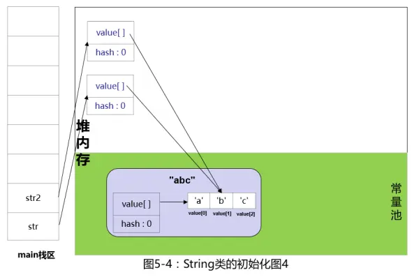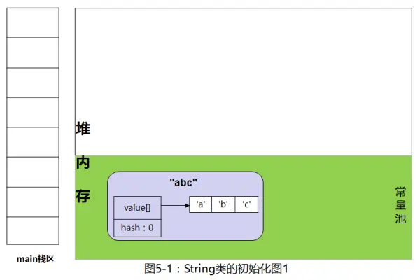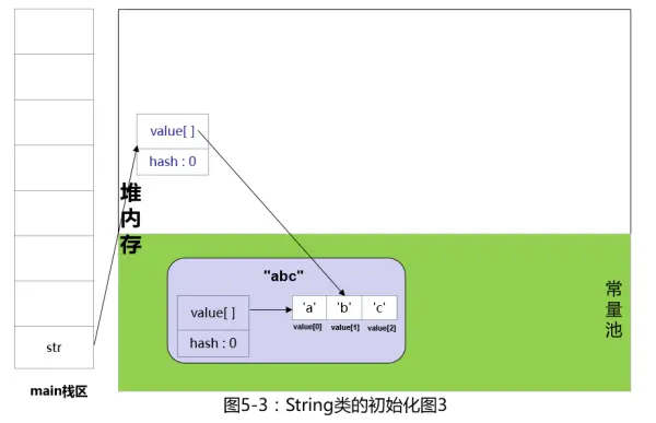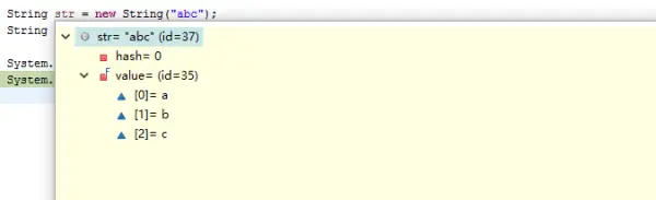 在Java中,当值被双引号引起来(如本示例中的"abc"),JVM会去先检查看一看常量池里有没有abc这个对象,如果没有,把abc初始化为对象放入常量池,如果有,直接返回常量池内容。下图是预先处理String str = new String("abc")的参数"abc"