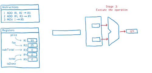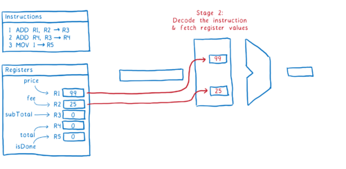 这就是指令如何像流水线工人一样工作,理想的情况是第二个指令会紧紧地跟着第一个指令,当第一个指令进行到步骤 2 的时候,第二个指令进行步骤 1
