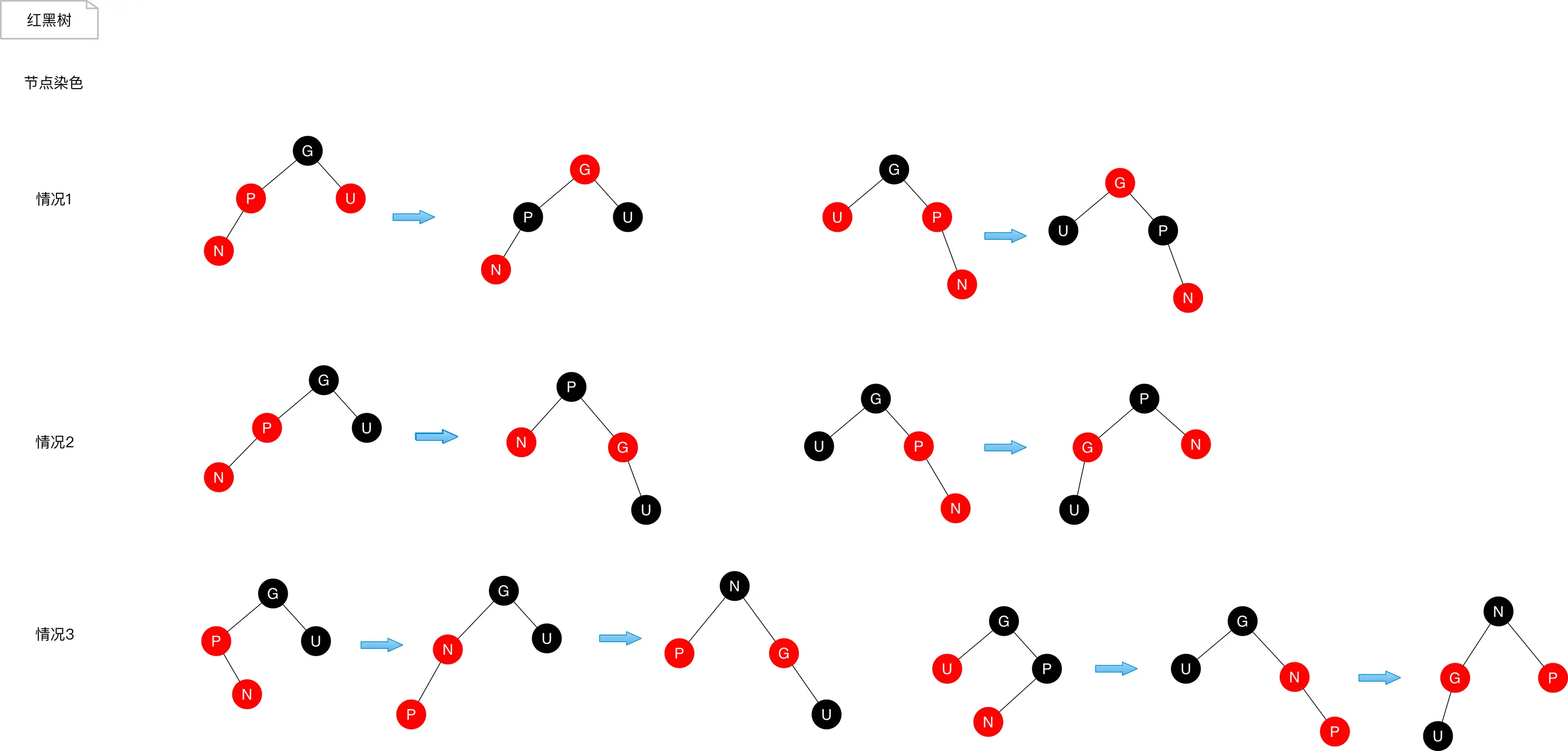 - 通过旋转和着色,使其重新变成一棵复合规则的红黑树。