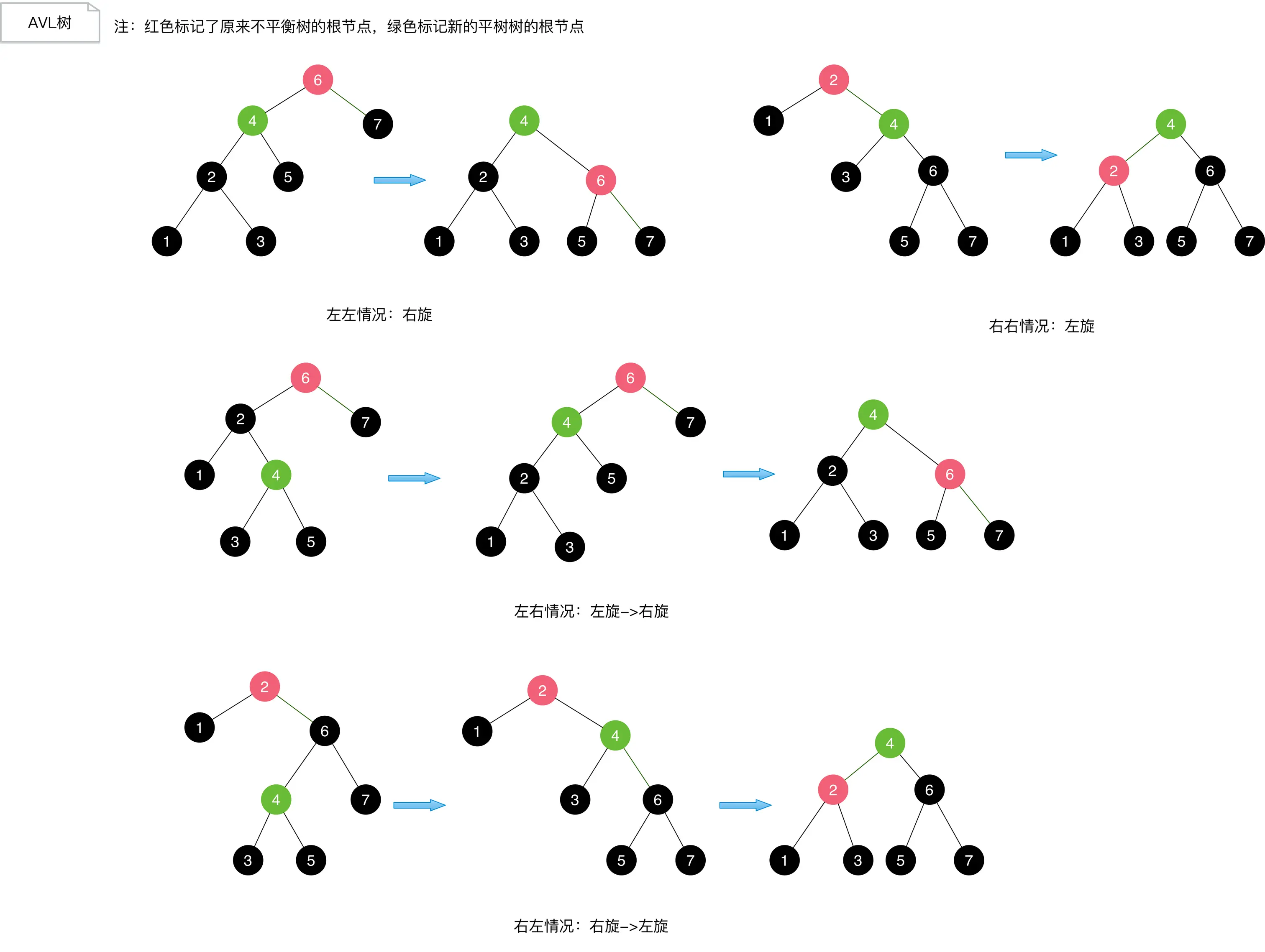 我们来看看不同情况下AVL旋转如何进行。