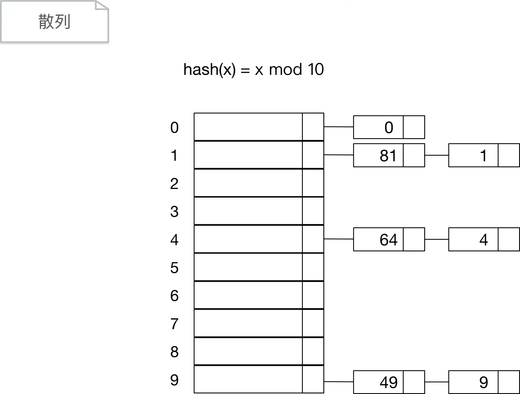 分离链接法将拥有相同哈希值的所有元素保存到同一个单向链表中,所以这种散列表整体上是一个数组,数组里面存放的元素时单向链表。