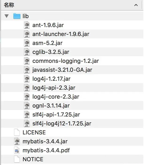 解压后就是这些文件,lib下面主要存放的一些依赖包,比如显示日志的log4j,mybatis-3.4.4.jar就是核心包了。于是我们新建一个java工程,将lib下面的jar包和核心包一起导入工程,因为还要操作数据库,所以别忘了你的数据库驱动jar包。