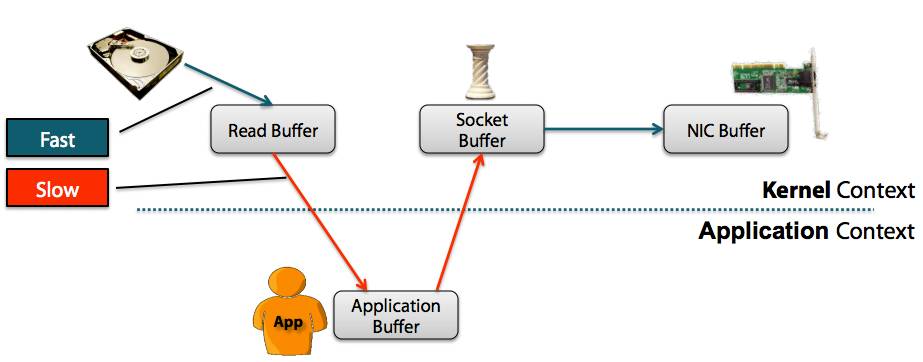 上面是 wiki 的一描述,它通常是指计算机在网络上发送文件时,不需要将文件内容拷贝到用户空间(User Space)而直接在内核空间(Kernel Space)中传输到网络的方式,所谓的两个空间只是说明两个不一样的内存区域,通过减少不同内存区域的拷贝,减低 CPU 的消耗。下面有两张对比图: