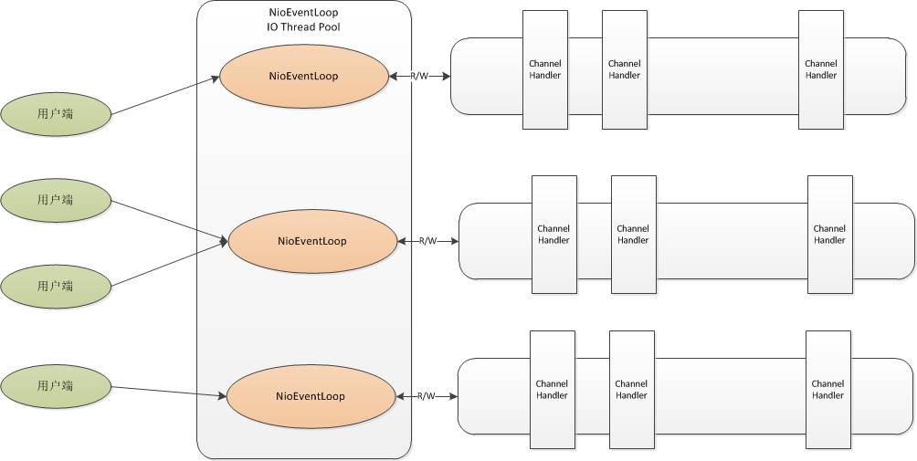 I/O 线程池((NioEventLoopGroup)分配一个 NioEventLoop 处理 Channel 数据,从 Channel 读数据,并将数据交给 handler 处理,handler 处理完后,向 Channel 写数据