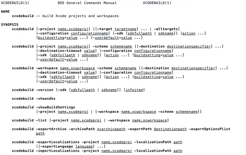 可以在终端输入man xcodebuild来查询相关用法