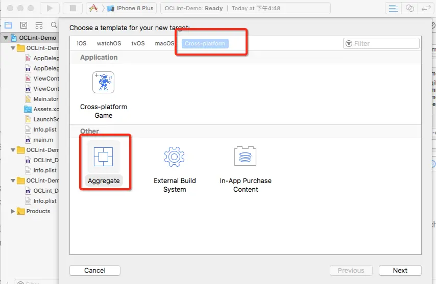 在Cross-platform选项中,选“Aggregate”,然后命名为"OCLint":