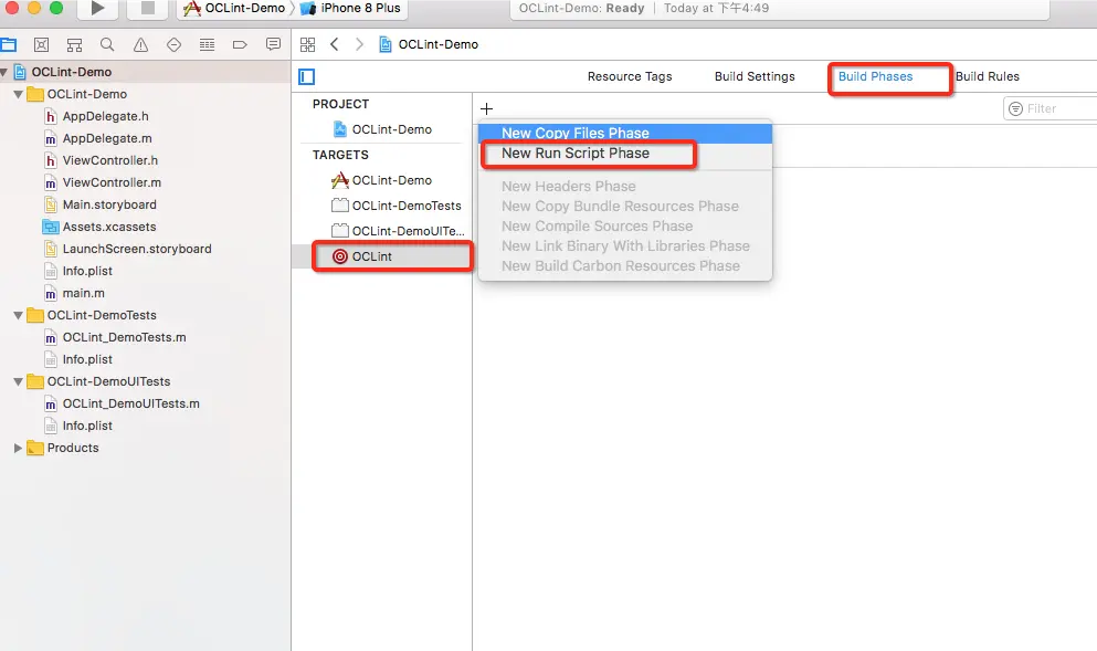 接着选中OCLint Target,进入Build Phases选项,点左上角的加号,选择“New Run Script Phase”