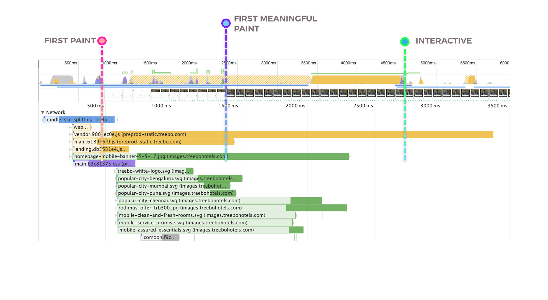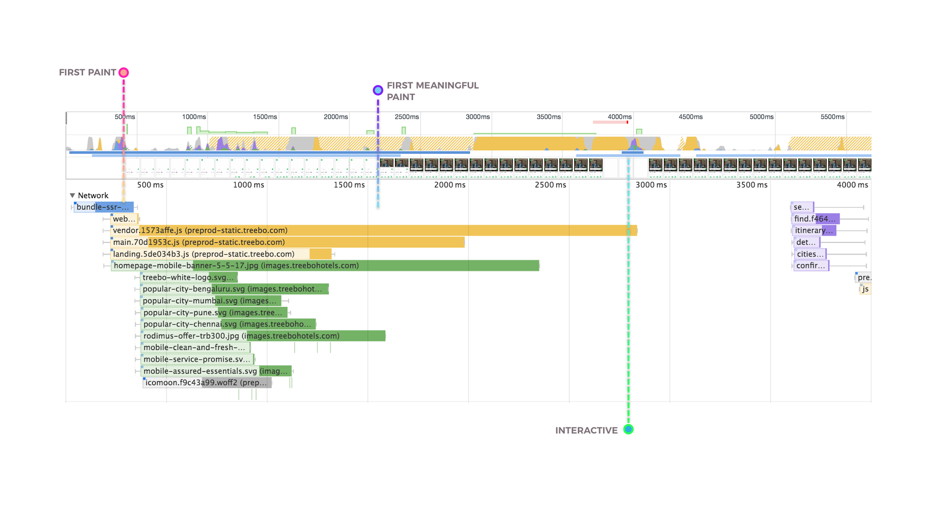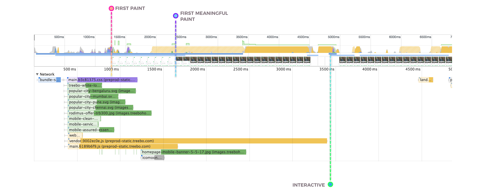 理想中,为了避免对关键资源下载的流量争用,Treebo不希望在页面初始加载所有应用分割的模块,对于移动端用户,在下次访问时,如果没使用service-worker来缓存,也确实浪费宝贵的流量。如果我们看看Treebo在持续交互方面做的怎样,仍然有许多空间可以改善: