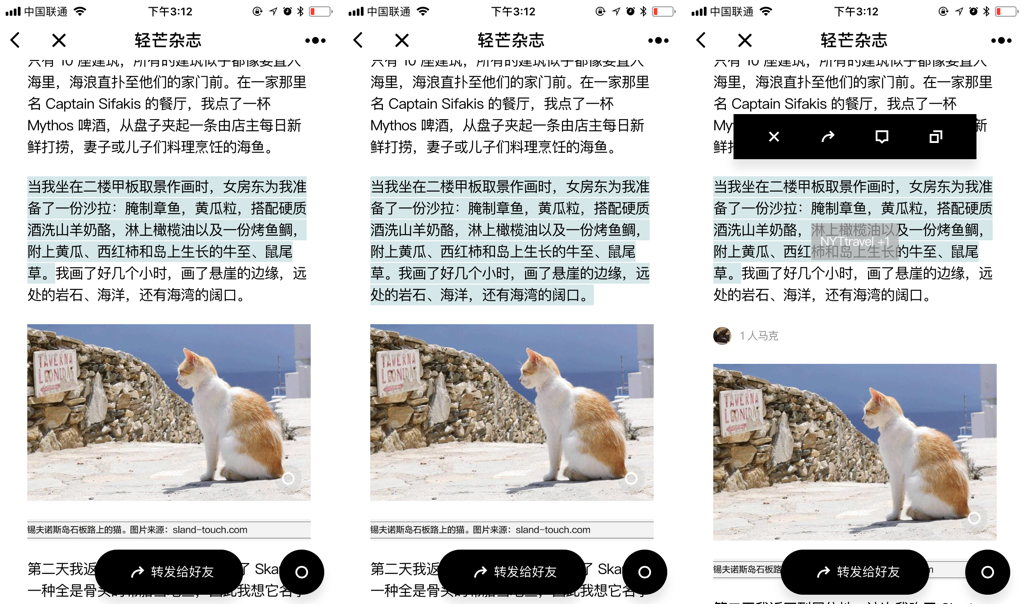 打开轻芒杂志进入任何一篇文章,长按文字,吸附选中当前的句子,像推动游戏摇杆似的上下搓动,可以快速调整需要选择的句子和段落,然后,放手就成了(效果如下组图)。