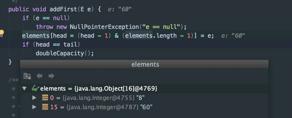 integers.addFirst(60);然后当head == tail的时候表示数组用满了,需要扩容,就执行doubleCapacity扩容,这里的扩容和 ArrayList 的代码差不多,就不去分析了。