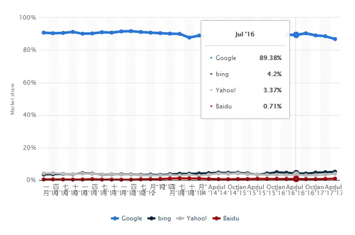 截止到2017年7月,Google在美国搜索市场的占有率为86.8%,相比去年同期下滑了3%左右,主要是受到Bing、Yahoo等搜索引擎的微弱增长影响。