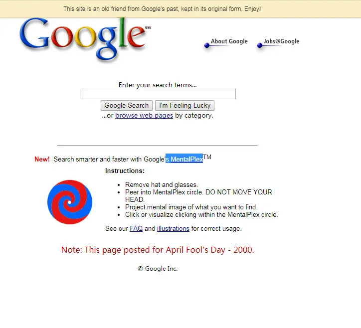 从2000年的4月1日开始,Google把愚人节玩笑做成了一项传统,当年的第一个玩笑,是Google宣布全新的搜索方式,用户无需输入文字,只要盯住屏幕上不断旋转的漩涡动图,就可以自动把心里的想法传送到电脑里去。