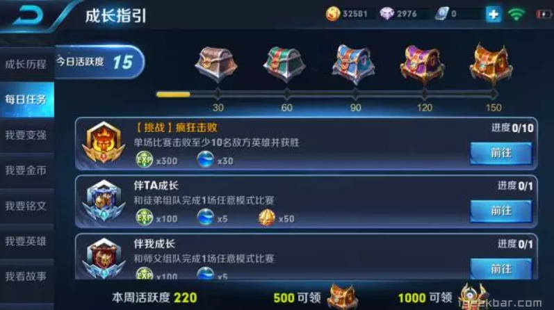 每日任务是王者荣耀中也是不可缺少的一部分,比如“每日登录”,比如:“击败对方10个英雄并取得胜利”,完成任务送经验、活跃度、或者某英雄体验,并在每日任务中设置活跃度开宝箱,都是非常好的用户成长体系,很好的引导用户去做产品希望他们去做的事情,值得我们借鉴学习。