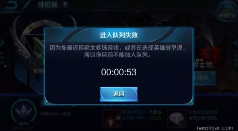 目前“王者荣耀”增加了游戏时间提醒,以免玩家过于沉迷游戏。另外,如果在组队中,未点击“进入”会限制1min不能匹配或被匹配,玲子每次被限制的时候,都会激起我对“王者荣耀”的“愤懑”之心,不甘心,死等,一定要玩。