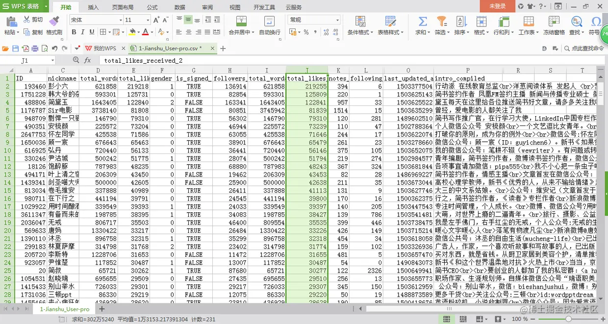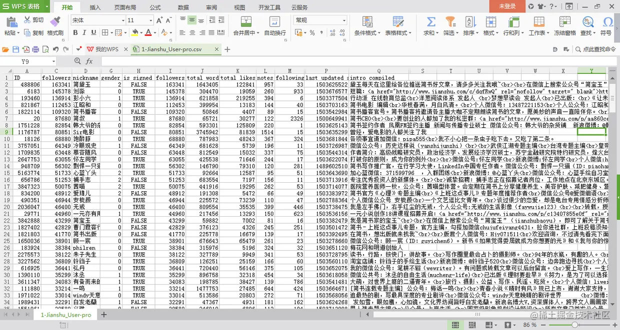 写好爬虫代码,爬取数据并存入CSV文件里,发现一共230名推荐作者。但由于部分数据乱码,也是很奇怪,以前爬知乎和微博,也是找API从JSON里提取数据,并不会有一部分出现乱码。无可奈何,只能对应的补救下。由于数据里不包含粉丝数等信息,需要再根据每个推荐作者的ID,到各自主页爬取数据,整合后格式如下: