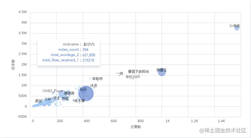 可见**虽然@Sir电影以一己之力将图表大小扩大到了Plus款,但敌不过@彭小六才是当之无愧的“吸赞狂魔”啊,394篇文章,621858字数,219218赞数。**就问你怕不怕。
