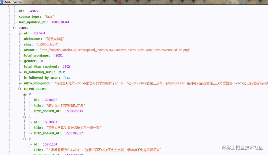 用fiddler软件抓包手机上的简书app数据。找到API,看到返回的JSON数据,格式齐整: