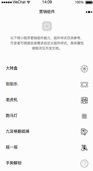 wxapp-market 是凹凸实验室推出的一款基于微信小程序的营销组件,用于快速开发营销玩法类小程序项目页面,包含大转盘、刮刮乐、老虎机、水果机、九宫格翻纸牌、摇一摇、手势解锁等多种营销组件。