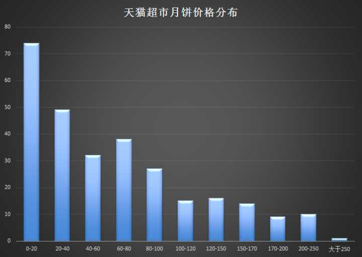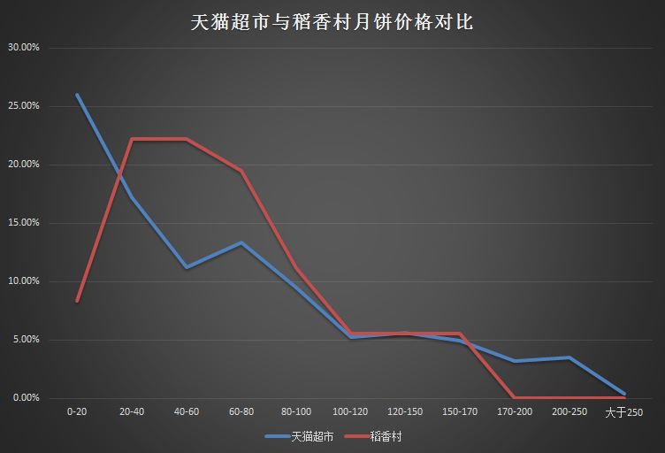 价格相当亲民,价格低于100的月饼占比77.19%,但是稻香村的定价策略就完全不同,如下图,稻香村的价格区间和天猫超市的上货价格区间差异很有意思。