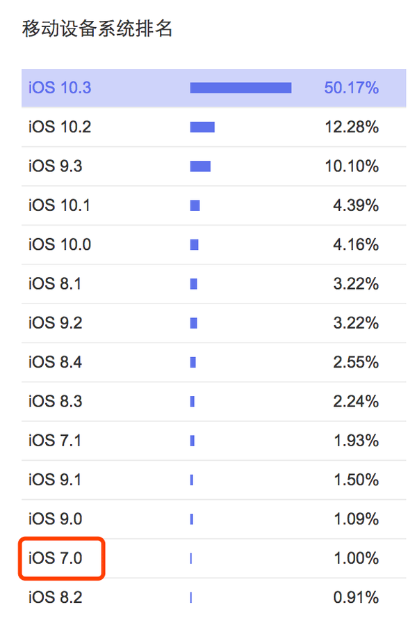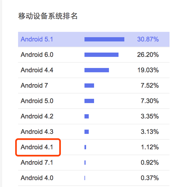 再来看一下百度给出的移动设备的统计情况,分别是安卓和ios,可以发现现在需要兼容安卓4.1+,IOS7+,这里百度给出的数据,当然你应该根据自己产品的统计情况来确定兼容情况