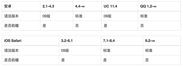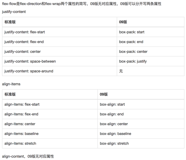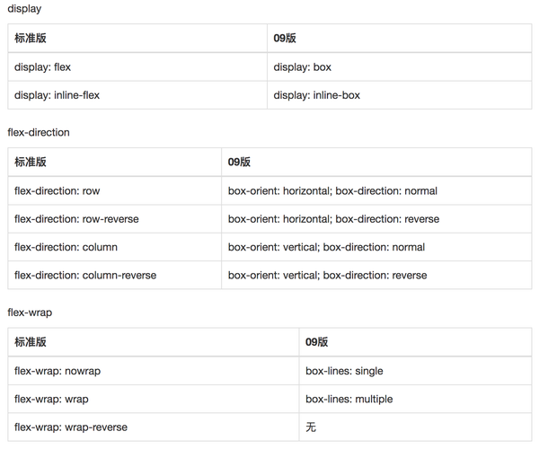 通过上面的目标和caniuse,很容易得出我们需要写09和标准两版语法,只有在两版语法中都存在属性才能使用,下面给出两版语法的对照关系,注意这不是语法指南,语法指南请看结尾处的推荐资料