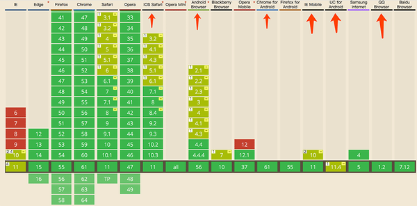 上图中红色箭头代表我们应该兼容的浏览器情况,在国内,UC和QQ浏览器的份额不容忽视,上图中的 1 2 3 其实代表flex的三版语法,flex有09年版语法,11年版语法和标准语法;右上角带黄色小方块的代表需要添加-webkit-前缀