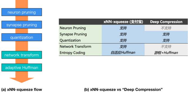 xNN-xqueeze 的模型压缩流程如下图之(a)所示,包括神经元剪枝 (neuron pruning)、突触剪枝 (synapse pruning)、量化 (quantization)、网络结构变换 (network transform)、自适应Huffman编码 (adaptive Huffman)、共5个步骤。其中前三步理论上是有损的,而使用xqueeze对网络权重和压缩超参进行finetune,能够将精度的下降保持在可控甚至可忽略的程度。后两步则完全不影响网络的输出精度。整个流程不仅会减小模型的尺寸,还通过网络的稀疏化和结构优化,显著提高前向预测的速度。