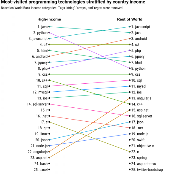 简评:Stack Overflow 分析了其网站上各编程语言标签的访问情况:高收入国家倾向用 Python、R(重视科研)、C 与 C++(重视教育);低收入国家则更多使用 PHP 与 Android 开发。