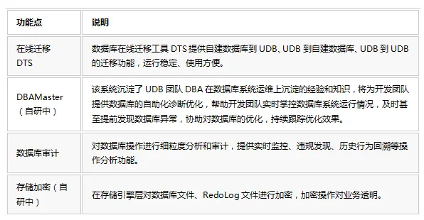 在运维方面提供面向 DBA 的数据迁移工具 DTS ,以及面向开发团队定位为开发人员身边的自动化 DBA 专家的 DBAMaster 产品。在安全上提供存储加密和数据库审计功能。
