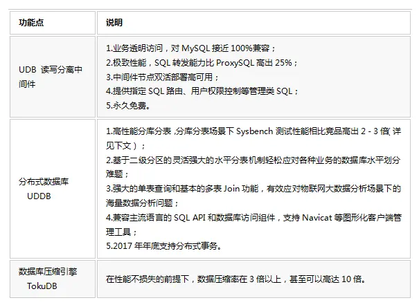 提供读写分离、分布式数据库两大产品,有效解决用户在数据高速增长下遭遇的数据库性能和容量问题。同时 TokuDB 压缩存储引擎提供很好的压缩率,在不损失性能的同时为用户节省数倍成本。