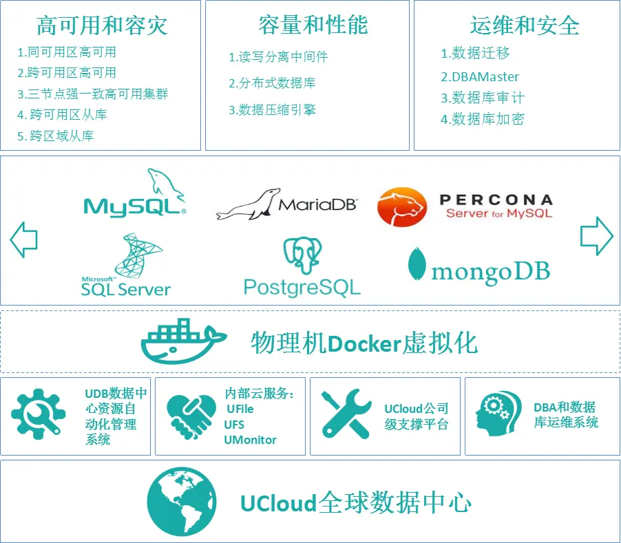 下面将展开介绍 UDB 产品围绕高可用和容灾、容量和性能、运维和安全这三个方面,构建的众多功能点。这些功能点和功能点的组合构造出一张大网,全方位覆盖用户需求。
