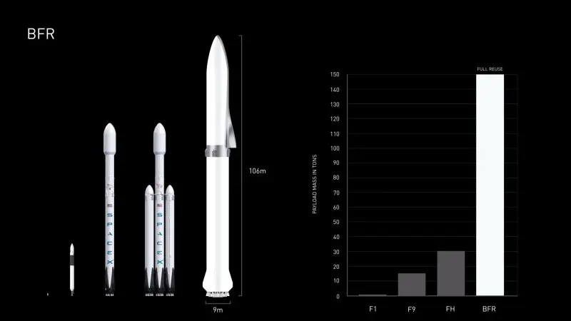 100% 回收。SpaceX 对 BFR 的期望是能担负从卫星发射、太空站补给、月球基地建设、乃至于火星基地建设的各种用途,因此设计了载人舱、载货舱、和太空加油船三种不同的酬载模式。