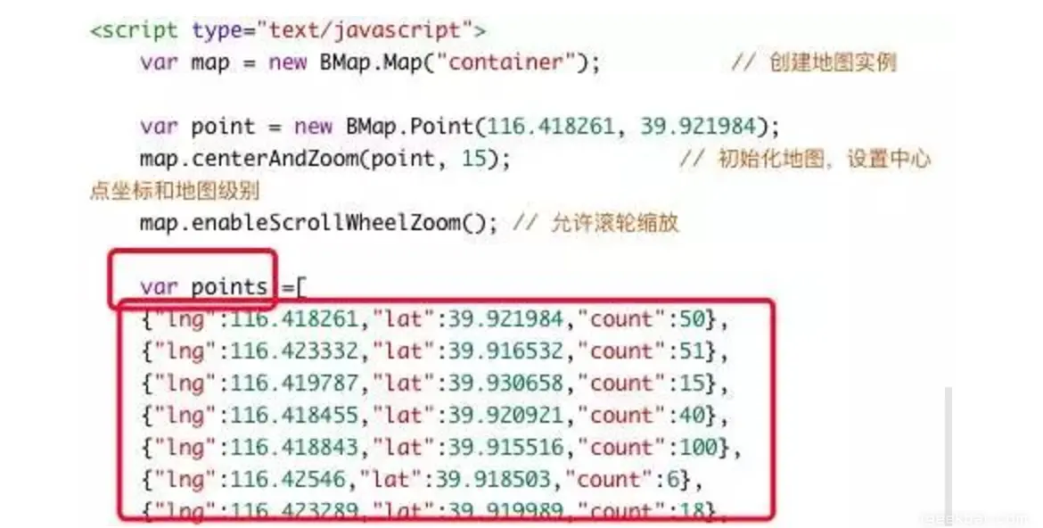 但是!百度地图提供了很多API使用示例,有 html 基础,大致可以看懂,有 js 基础就可以尝试改函数了(不会 js 的,我默默地复制源代码),仔细观察源代码,可以知道热力图生成的主要数据都存放在 points 这个变量中。