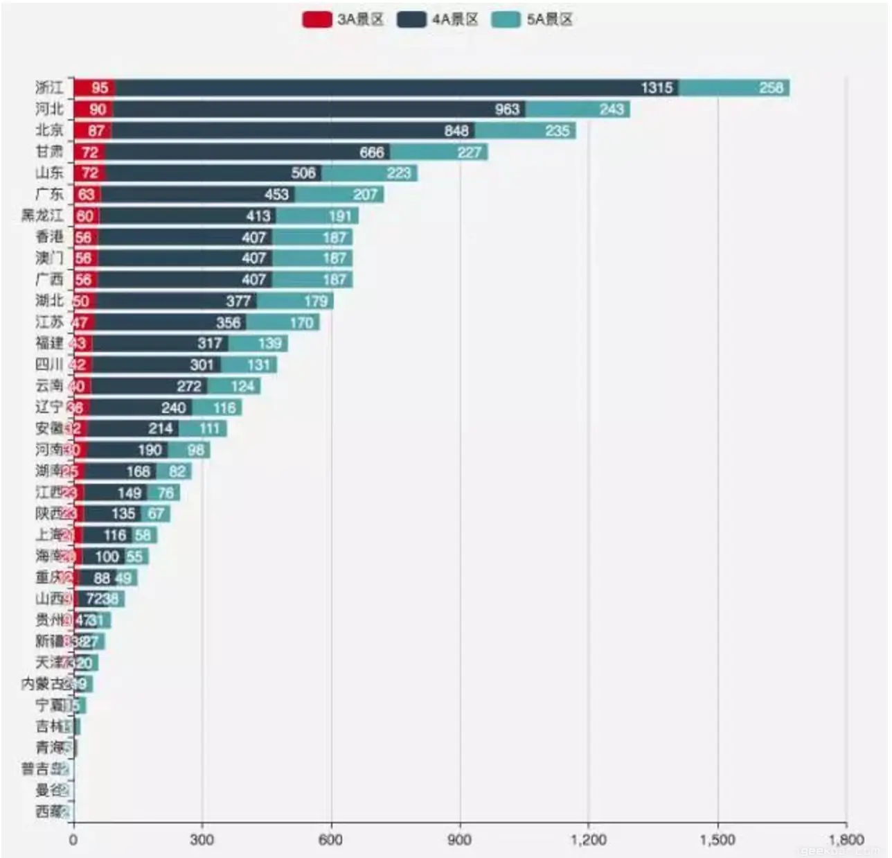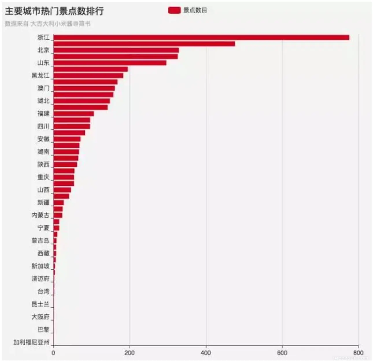 于是我又做了一个各城市包含热门景点数目的排行,没想到在 4 千多个热门景点中,数目最多的竟是我大浙江,是第二个城市的 1.5 倍,而北京作为首都也……可以说是景点数/总面积的第一位了。