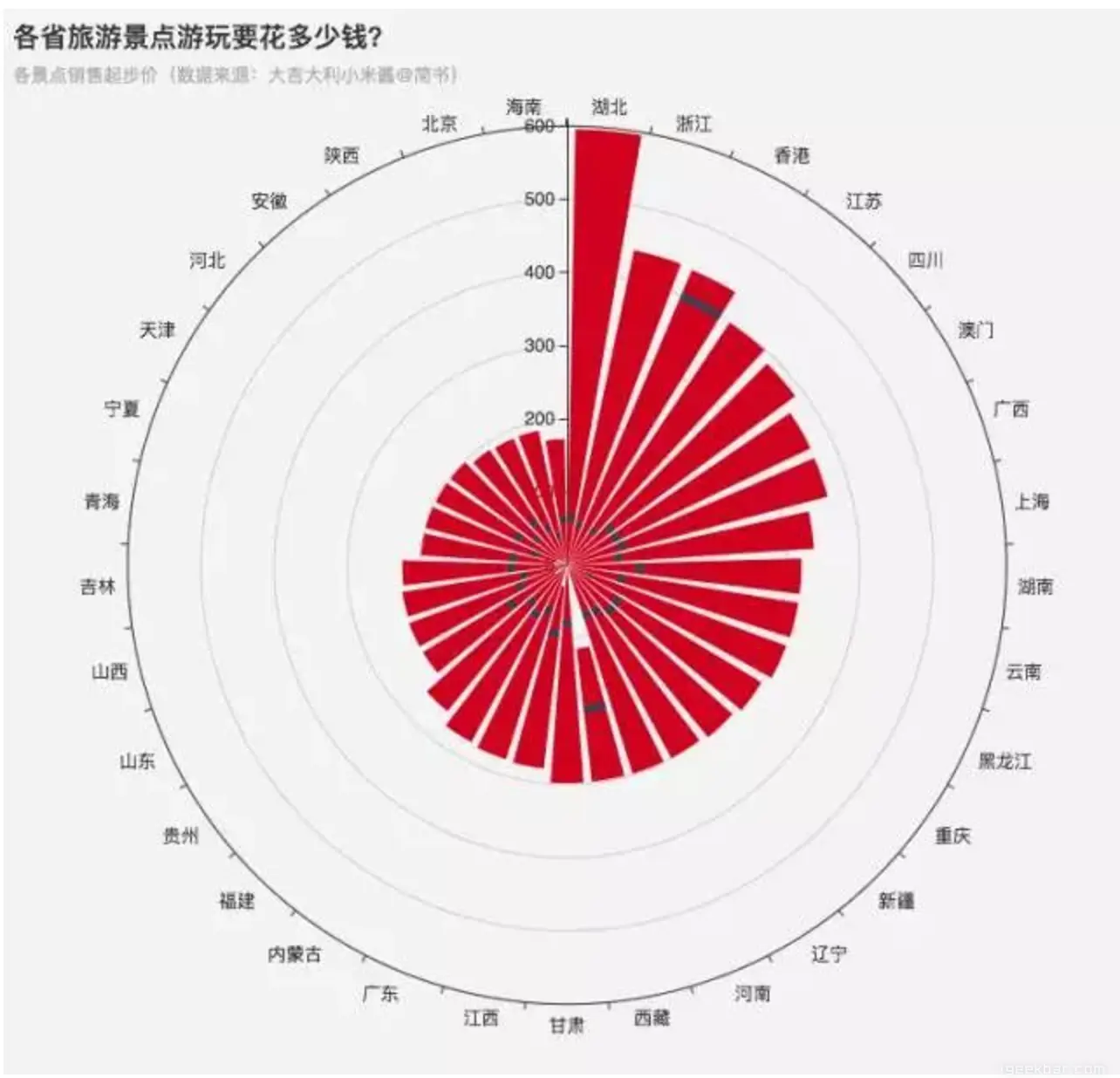 下图是由各城市景点销售起步价的最大值-最小值扇形组成的圆,其中湖北以单景点销售起步价 600 占据首位。