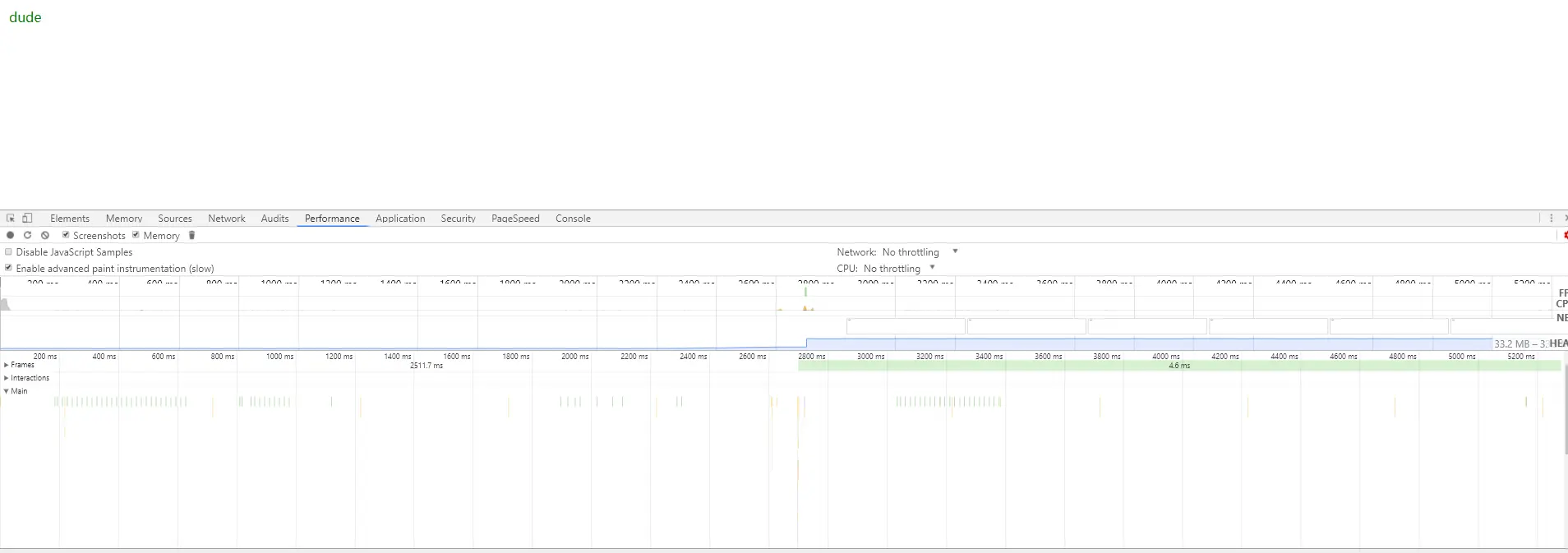 4.1.3、选中上图中蓝色(js堆)突然升高的部分,表示刚才点击body的过程,滚动鼠标放大主线程