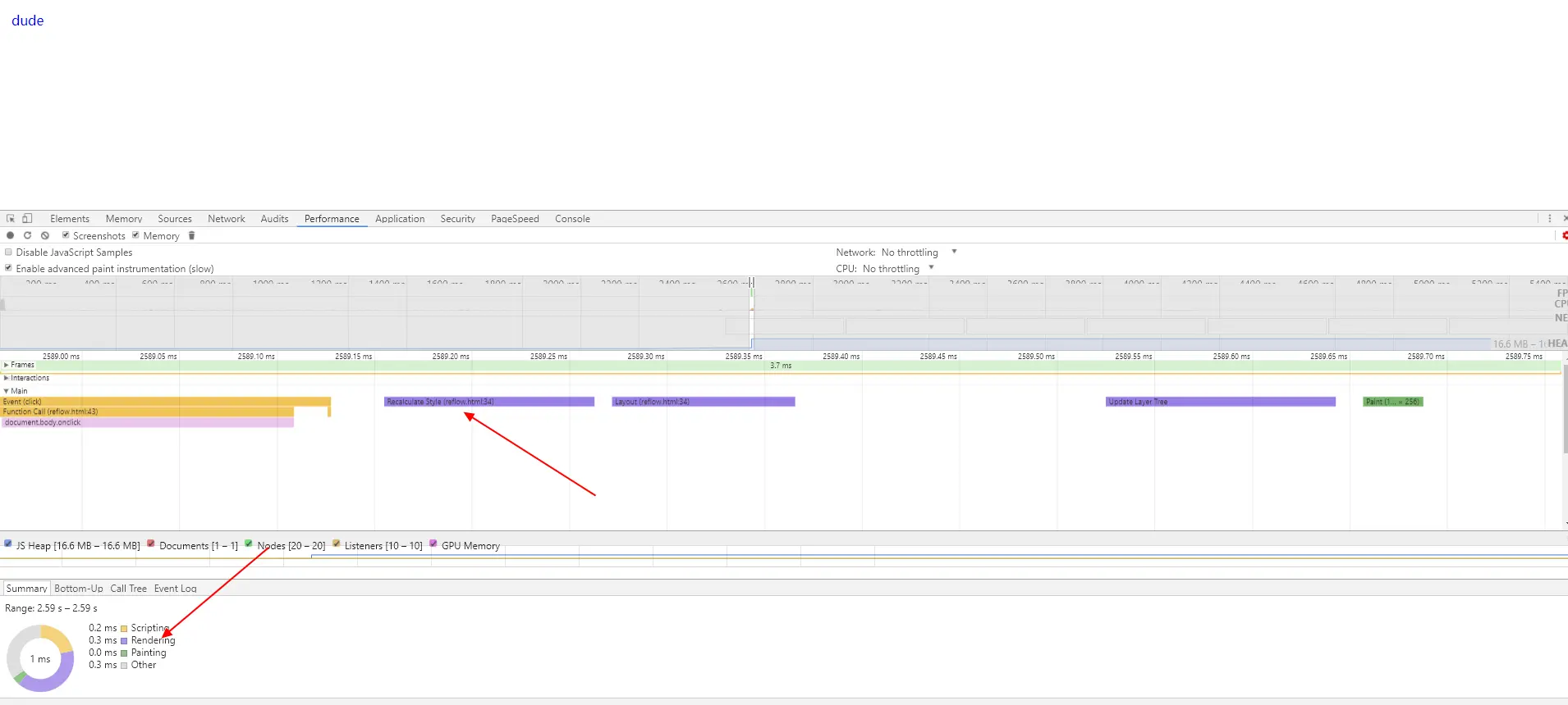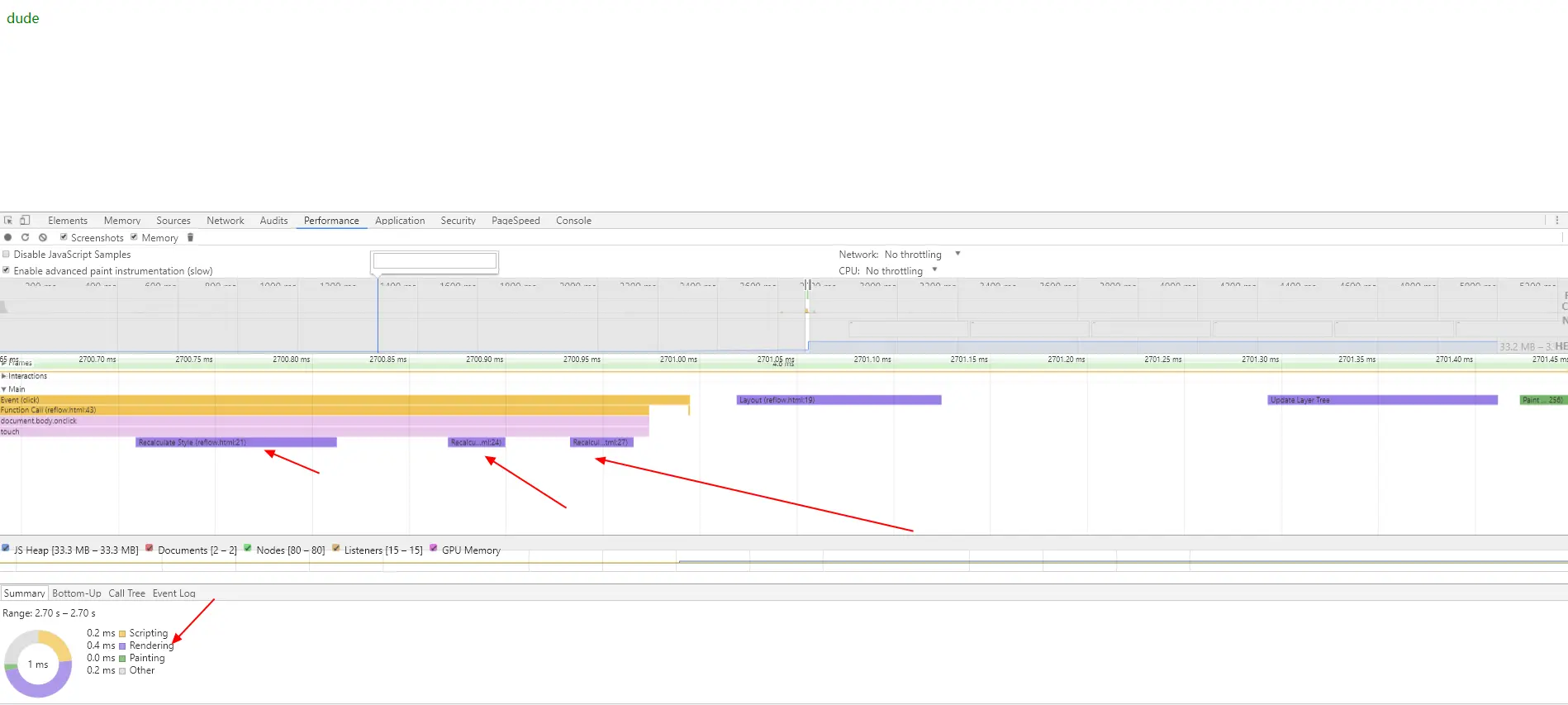 从上图我们可以很容易看到在再次点击body的过程中,浏览器只计算了1次样式。从而可以证明我们上述的浏览器批处理的结论。未优化的Rendering(渲染)时间为0.4ms,而优化后的Rendering(渲染)时间为0.3ms,在这么小的js执行都有这么大的差别,在一些操作DOM频繁的动画中,浪费的性能可想而知,后面将会有一个动画的例子可以直观的看出来。