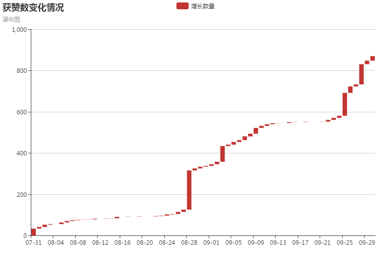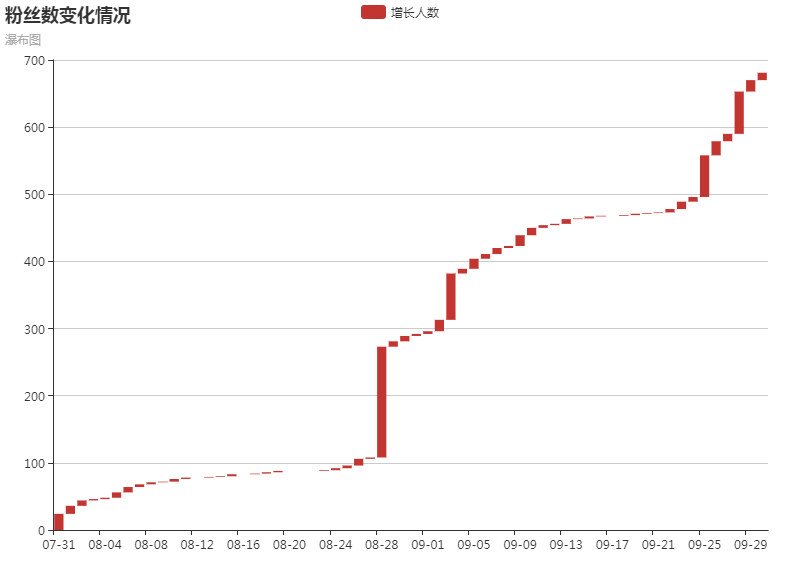 首先是这两个月的粉丝数变化情况,其实拿到图的一刻还是蛮开心的,几天之前还在眼巴巴盯着粉丝数,想着很难比第一个月(295)翻一倍,但如同所示,0925之后有两小波涨粉,于是突破了600,甚至逼近700。