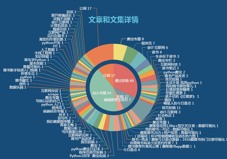 被加入专题64次,主要是爬虫、程序员方向;通过投稿49次,同上,方向较专一;17人次订阅我的文集《python爬虫和数据可视化》。
