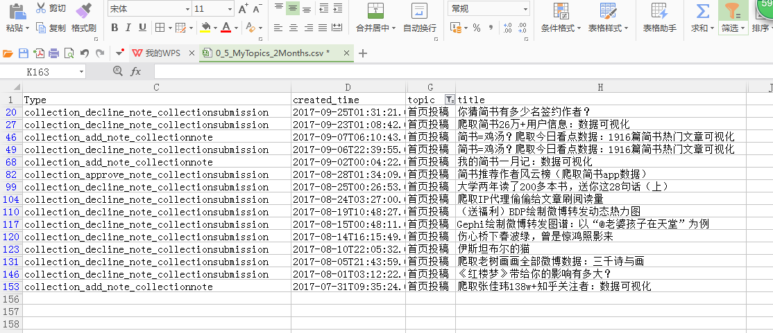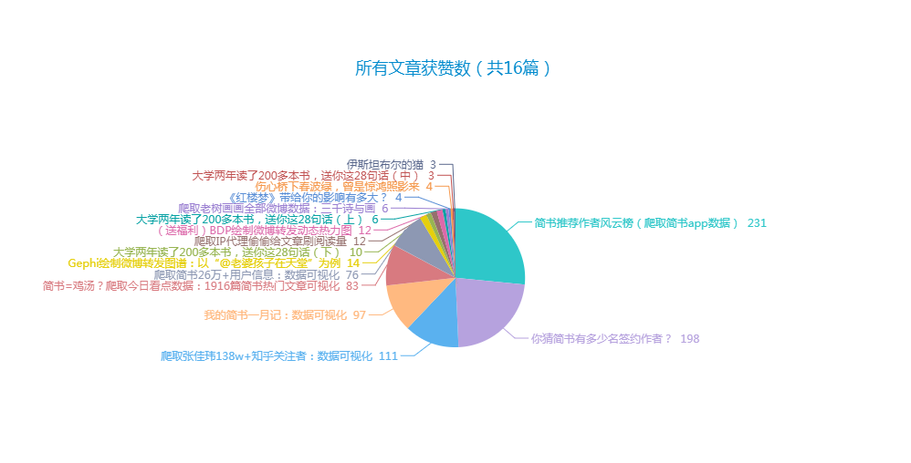 对所有文章的获赞数统计可知,最热门的两篇获赞数接近总数的一半。真大腿。其中除却处女作张佳玮138w+知乎关注者一文外,较热门的几篇均为近期的作品,可知在简书上的反馈越来越良性和正向。