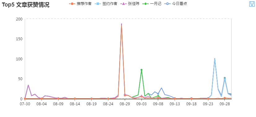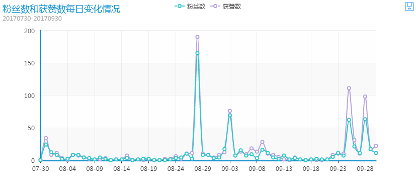 看完了总体的变化趋势,脑海中也还是模糊的“增长、增长”,“上升、上升”,那么再看看具体每一日的情形。由图可知,粉丝数和获赞数的高峰基本出现在相同的日期,其中最显著的分别为:0828、0903、0925、0928,和上面瀑布图里单日的柱形图一致。除却0928,其他三日均为前1-2天晚上有新的文章发布并后续出现在首页。