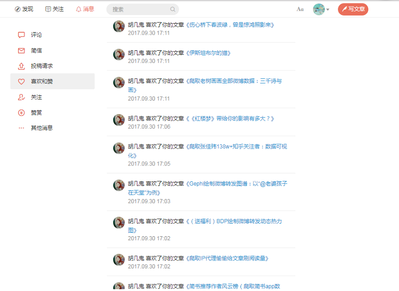 再是,爬取过蛮多简书数据,更新的相关文章也有好几篇,后续可能会挖掘下“简书交友”这一专题,有其他想法、对什么感兴趣内容的简友可以评论区里留言告知。