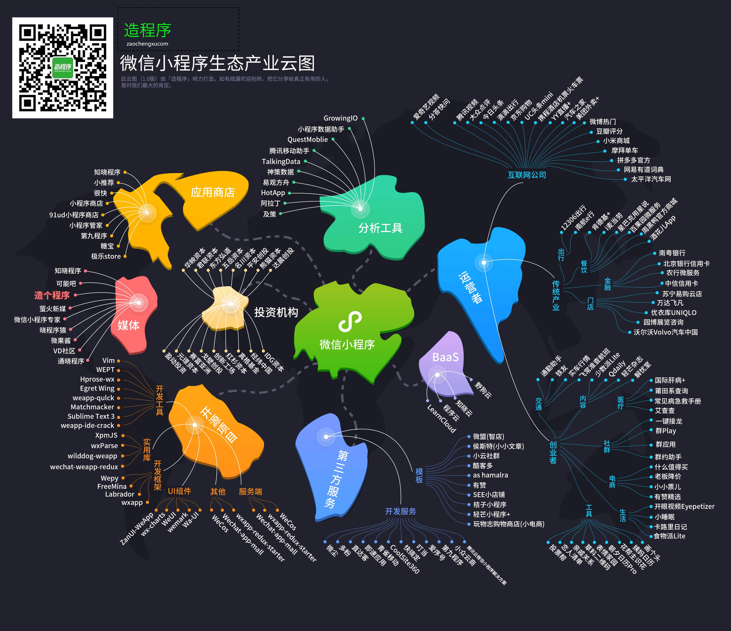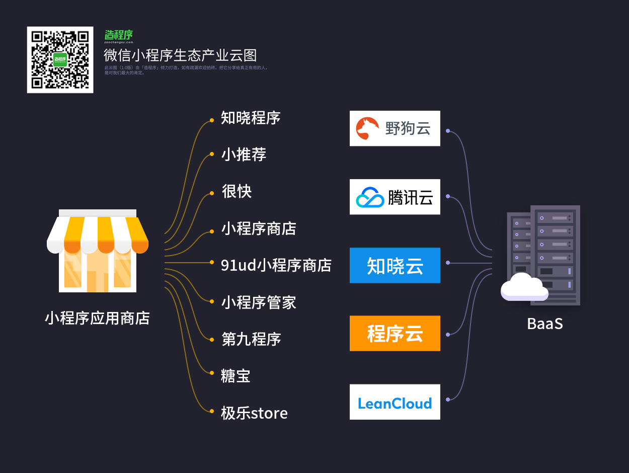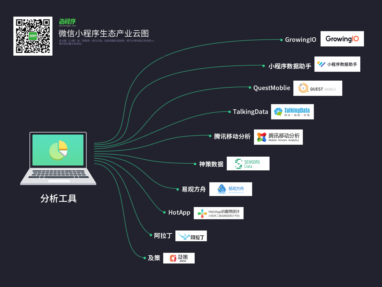 「微信小程序生态云图」由微信公众号「造程序」团队策划出品,花费了大量心血,仍不免有疏漏,未来我们会不断迭代,不断完善,力求让大家看到一个最全面、最具参考价值的小程序生态圈,关注微信公众号:造程序(微信号:zaochengxucom) 获取更多新鲜专业微信小程序资讯。在公众号,回复“云图”,可获取高清版微信小程序生态产业云图。